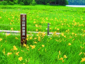 今年のキスゲの7/20現在の開花状況をお知らせします。今が満開といって良い状況ですが、昨年よりもツボミが少なく鹿に食べられたことも大きな原因と考えられ、昨年よりも大分少ない感じです。見晴らし分岐点の一角に集中している程度で寂しい感じがします。今年は、ワタスゲが良くてまだ大江湿原で多く見られます。